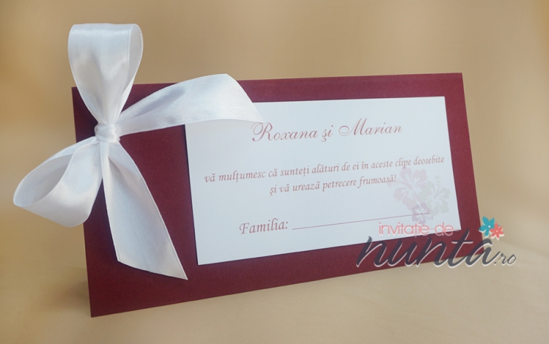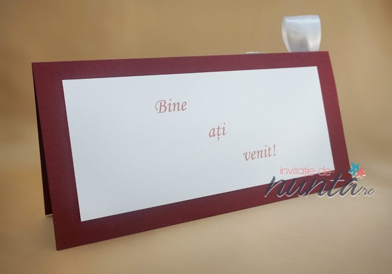 Plic de bani din carton grena, pliat pe verticala. Textul se tipareste pe 2 cartoane albe, cel de pe partea din fata avand un model floral. Plicul este accesorizat cu o fundita din panglica de culoare alba si poate fi folosit si pe post de card de masa.