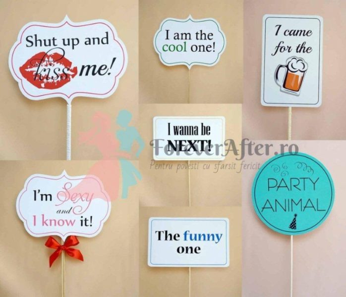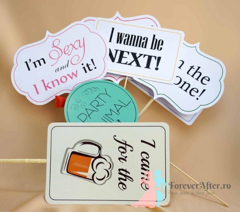 Semnele sunt confectionate din carton mat si au tiparite mesaje haioase in limba engleza. Cartoanele sunt dispuse pe betisoare din lemn pentru a fi folosite la fotografiile de nunta.