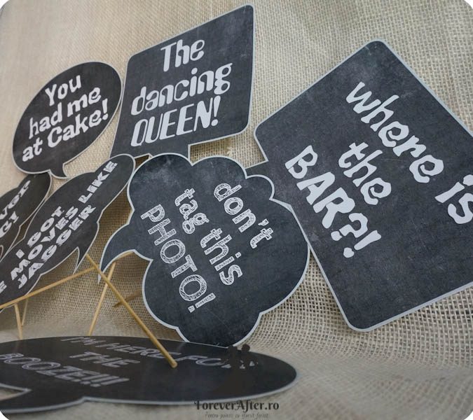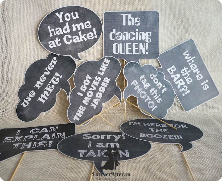 Semnele sunt confectionate din carton mat si au tiparite mesaje haioase in limba engleza, tiparite pe design de tabla scolara. Cartoanele sunt dispuse pe betisoare din lemn pentru a fi folosite la fotografiile de nunta.