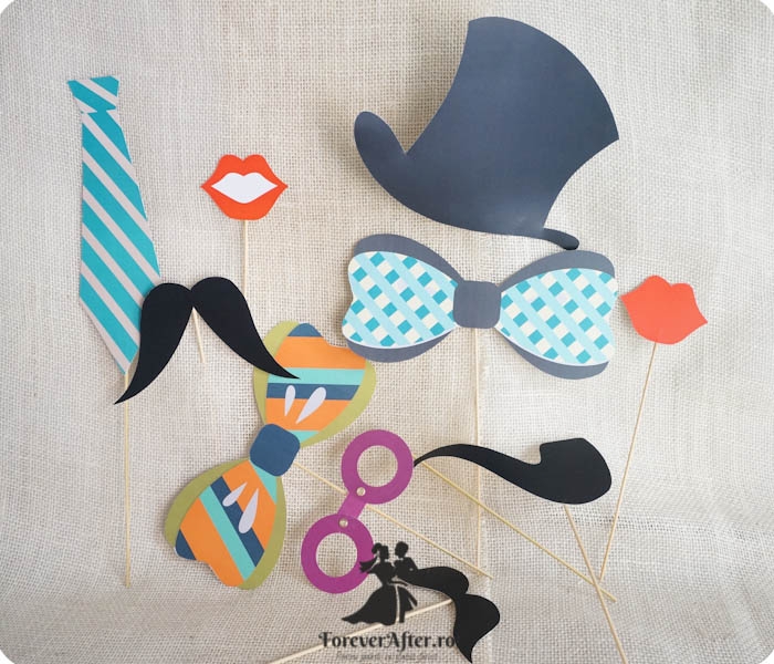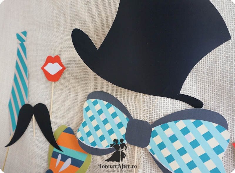 Setul contine 10 decupaje in forma de papioane multicolore gigant, buze, cravata, palarie, ochelari si mustata pentru amuzamentul invitatilor atunci cand pozeaza pentru fotografiile de nunta.