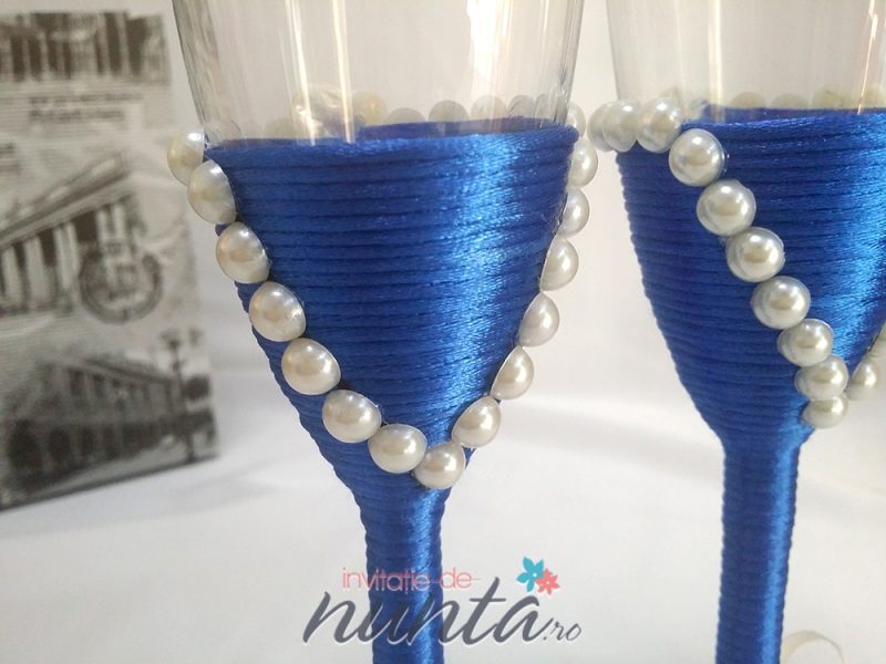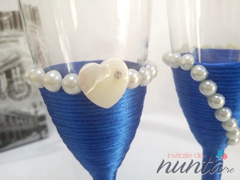 Un set de doua pahare elegante, cu piciorul imbracat in snur satinat de culoare albastra. Cele doua pahare sunt ornate cu perlute, inimioare si fundite in nuante de alb si albastru.