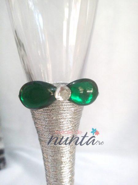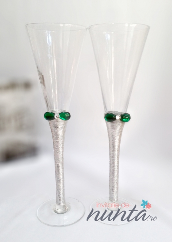 Un set de doua pahare elegante, cu piciorul imbracat in snur argintiu. Cele doua pahare sunt ornate cu pietricele verzi, in forma de fundita.