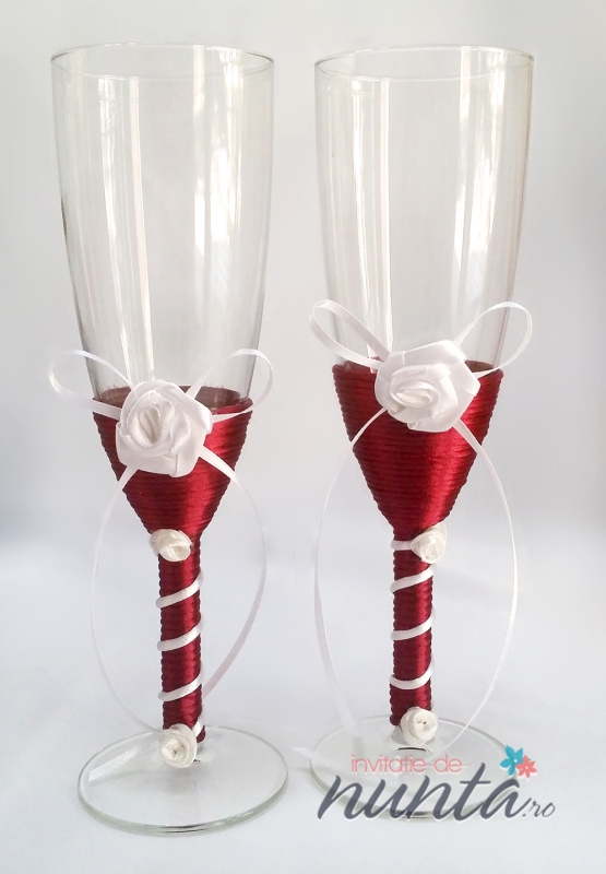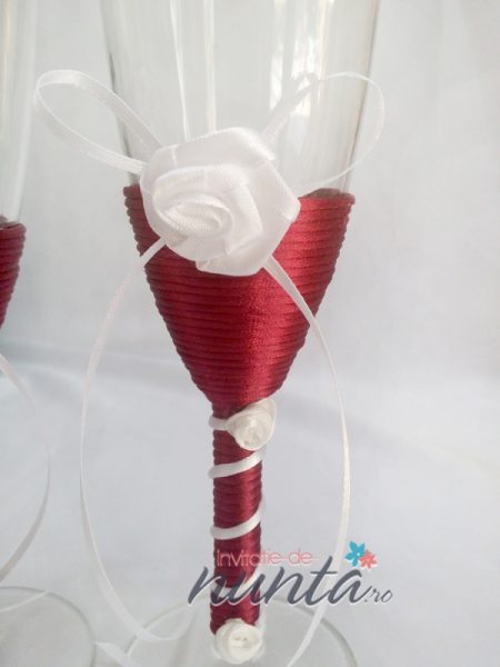 Un set de doua pahare elegante, cu piciorul imbracat in snur satinat de culoare grena. Cele doua pahare sunt ornate cu trandafirasi si fundite albe.