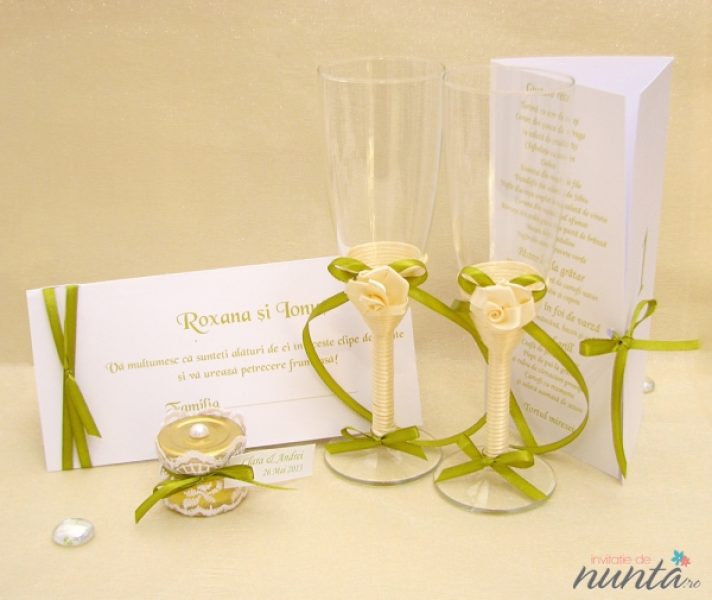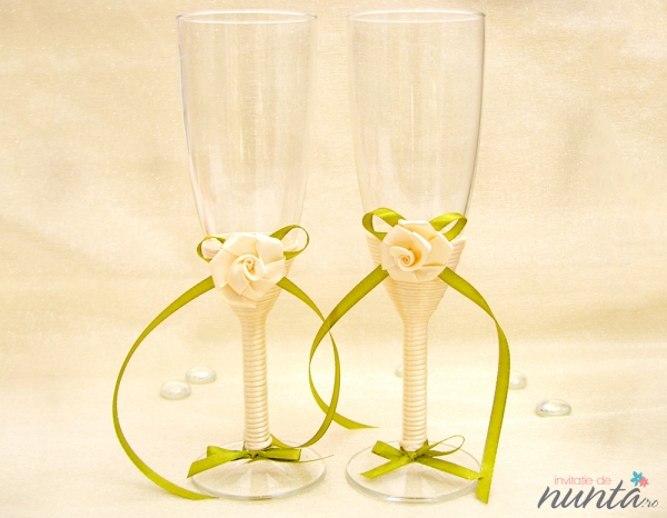 Un set de doua pahare elegante, cu piciorul imbracat in saten si ornat cu un trandafiras crem si fundita din panglica verde din acelasi material.