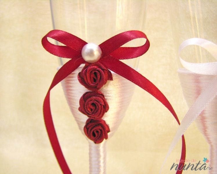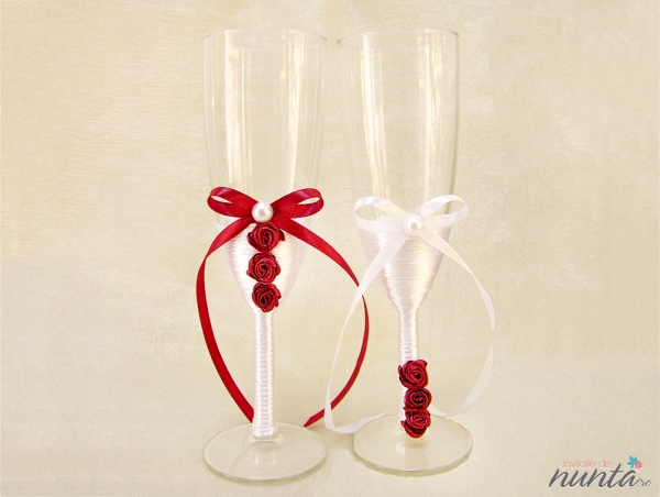 Un set de doua pahare elegante, cu piciorul imbracat in satin alb si ornate cu funde albe si grena, trandafirasi grena si perle.