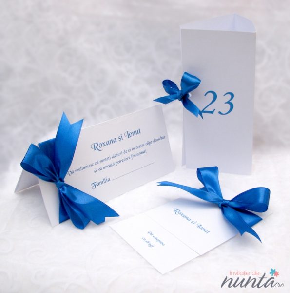 Se pot realiza in aceeasi gama asortata nuntii voastre si alte accesorii: carduri de confirmare, place-card-uri / plicuri de bani, marturii, meniuri si numere de masa, lista de asezare a invitatilor, etc.