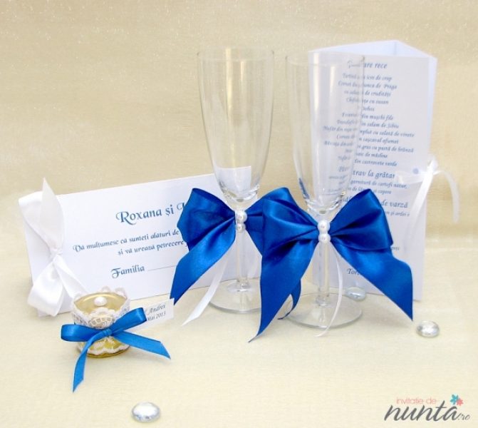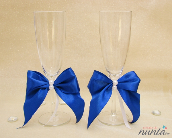 Un set de doua pahare elegante, ce au piciorul ornat cu funda albastra si perle albe.