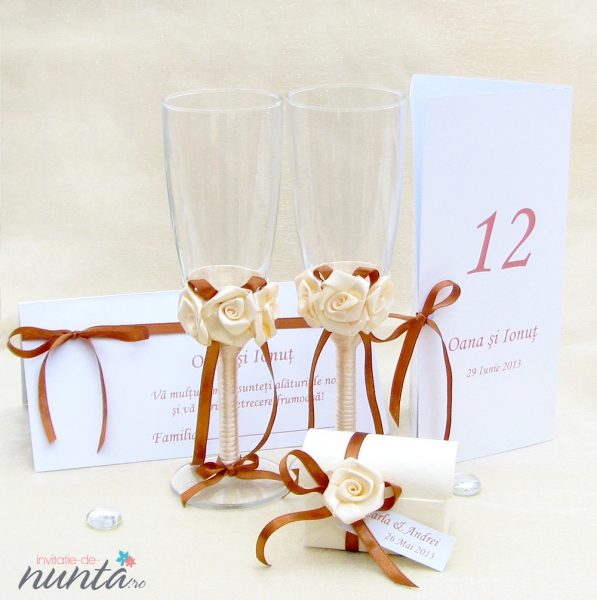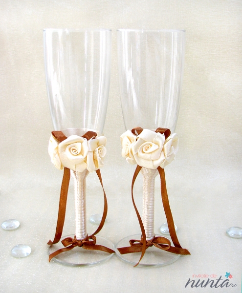 Un set de doua pahare elegante, cu piciorul imbracat in saten si ornat cu trandafirasi crem si fundita din panglica maro din acelasi material.
