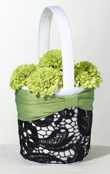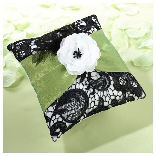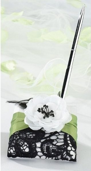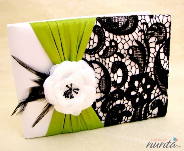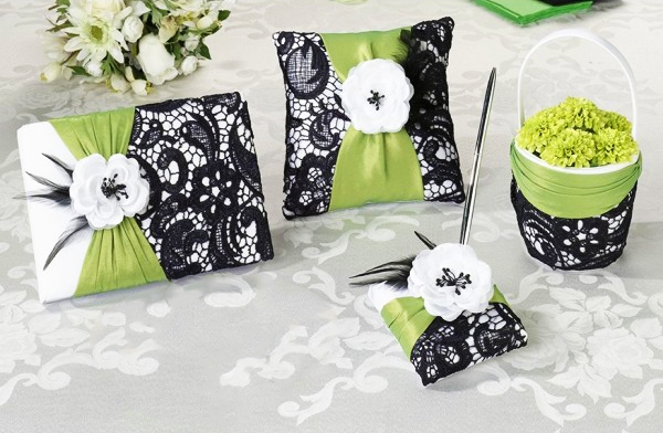 Un set de nunta deosebit, in nuante contrastante de alb, negru si verde, ce combina materiale precum dantela si satinul fin, intr-un design aparte. Fiecare produs al acestui set este accesorizat si cu un trandafir din material textil alb si cu pene de culoare neagra.