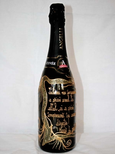 Sticla de sampanie personalizata cu motive aurii.