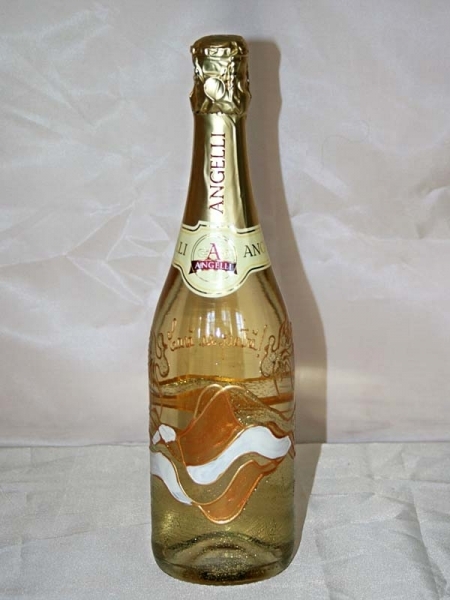 Sticla de sampanie personalizata cu un model in valuri c auriu si alb.