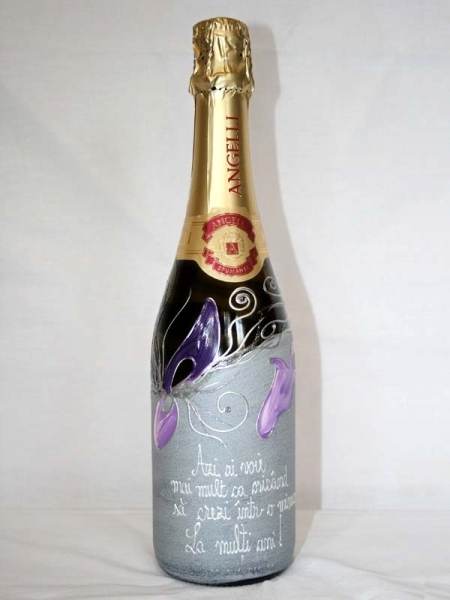 Sticla de sampanie personalizata gri cu motive florale lila cu argintiu.