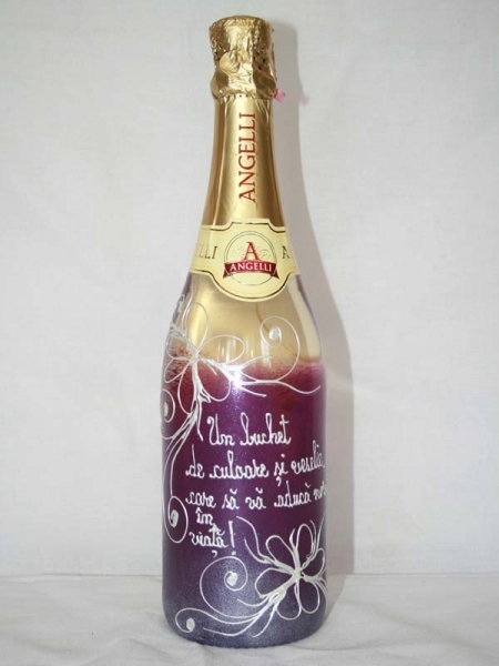 Sticla de sampanie personalizata mov cu motive florale albe.