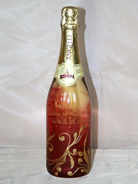 Sticla de sampanie personalizata cu rosu si modele si text aurii.