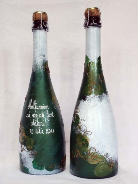 Sticla de sampanie personalizata verde cu alb si cu frunze cu margini aurii.