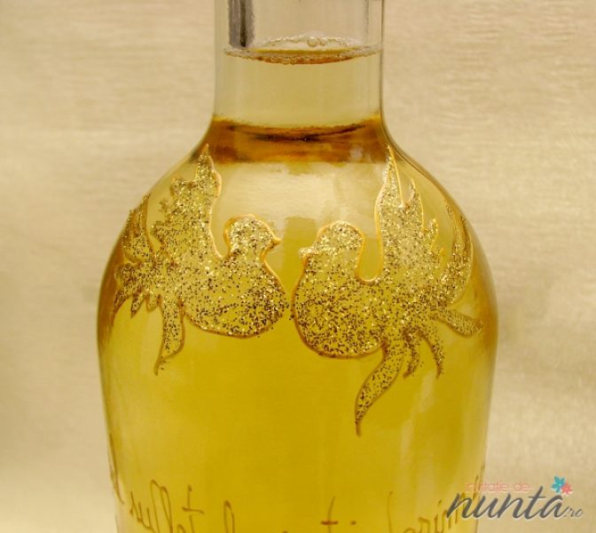 Sticla de vin personalizata cu flori negre cu margini aurii si doi porumbei aurii.