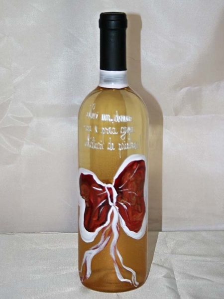 Sticla de vin personalizata cu o fundita rosie cu alb.