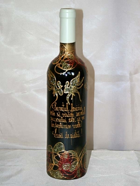 Sticla de vin personalizata cu modele abstracte aurii cu rosu si doi porumbei aurii.